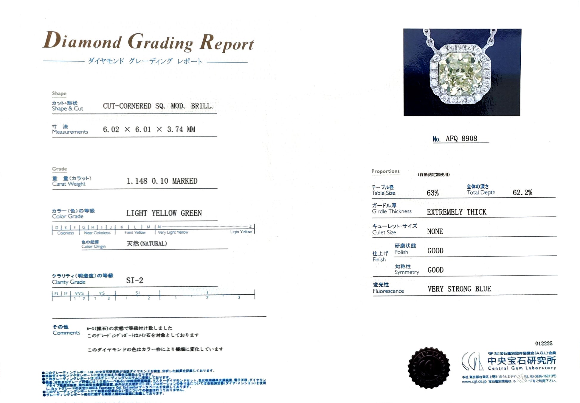 In a radiant shape, a 1.148-carat diamond exudes luxurious brilliance. The enchanting Light Yellow-Green color adds a special aura to this jewelry.