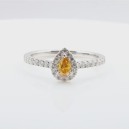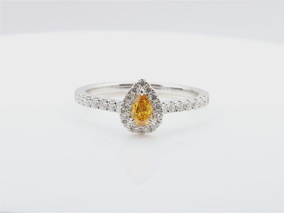 This exquisite ring showcases a 0.583ct Fancy Vivid Yellow Orange pear-shaped diamond, a rare and fiery hue known for its vibrant intensity.