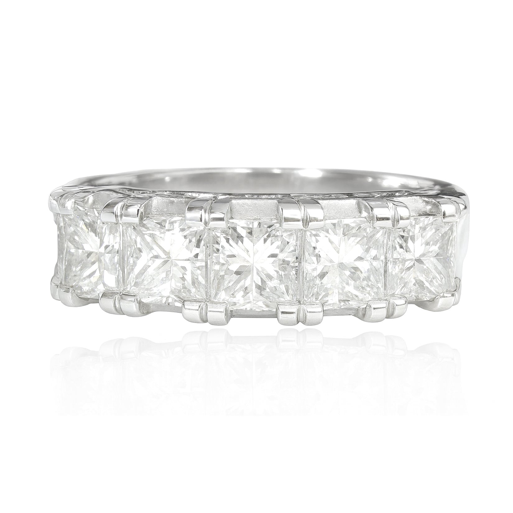 This sophisticated band ring showcases a clean, structured row of five princess-cut diamonds, totaling 1.5 carats, set in a sleek PT900 platinum setting.