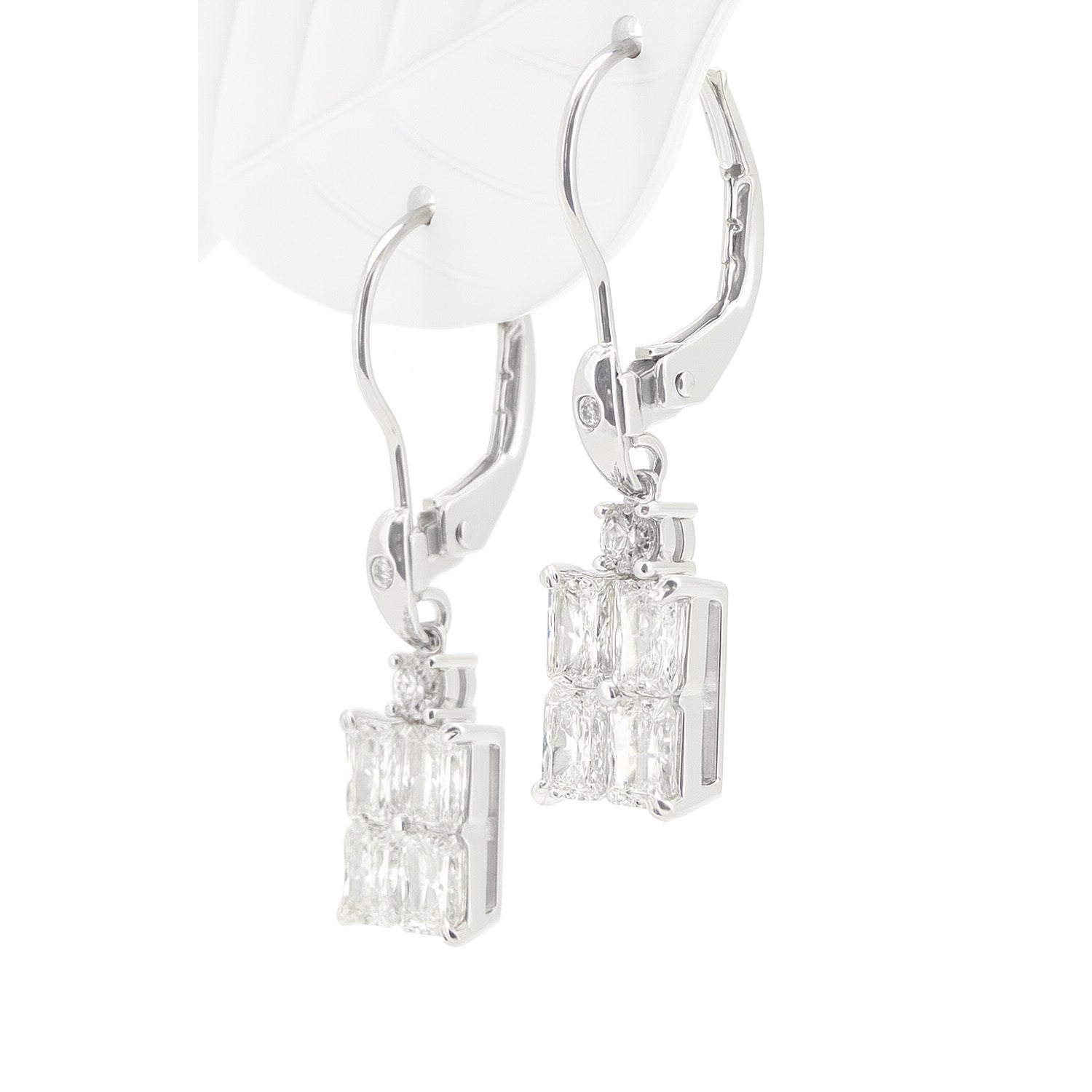 These striking diamond dangle earrings feature four radiant-cut diamonds on each earring, set in a refined combination of platinum (PT900) and 14K white gold.