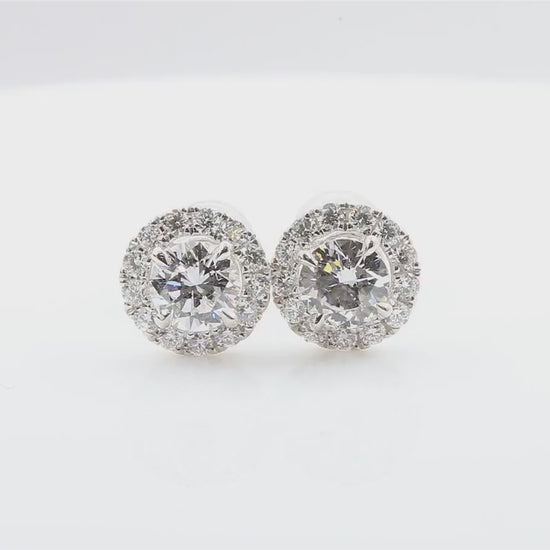 Each stud features a round brilliant-cut diamond in D and E color, graded SI1 for clarity, and surrounded by a delicate halo of smaller diamonds.