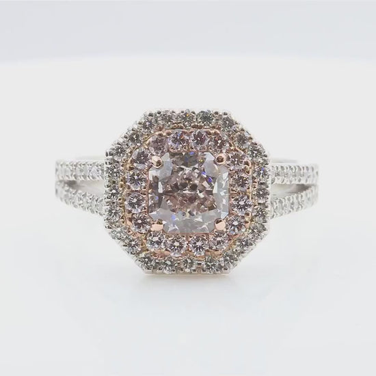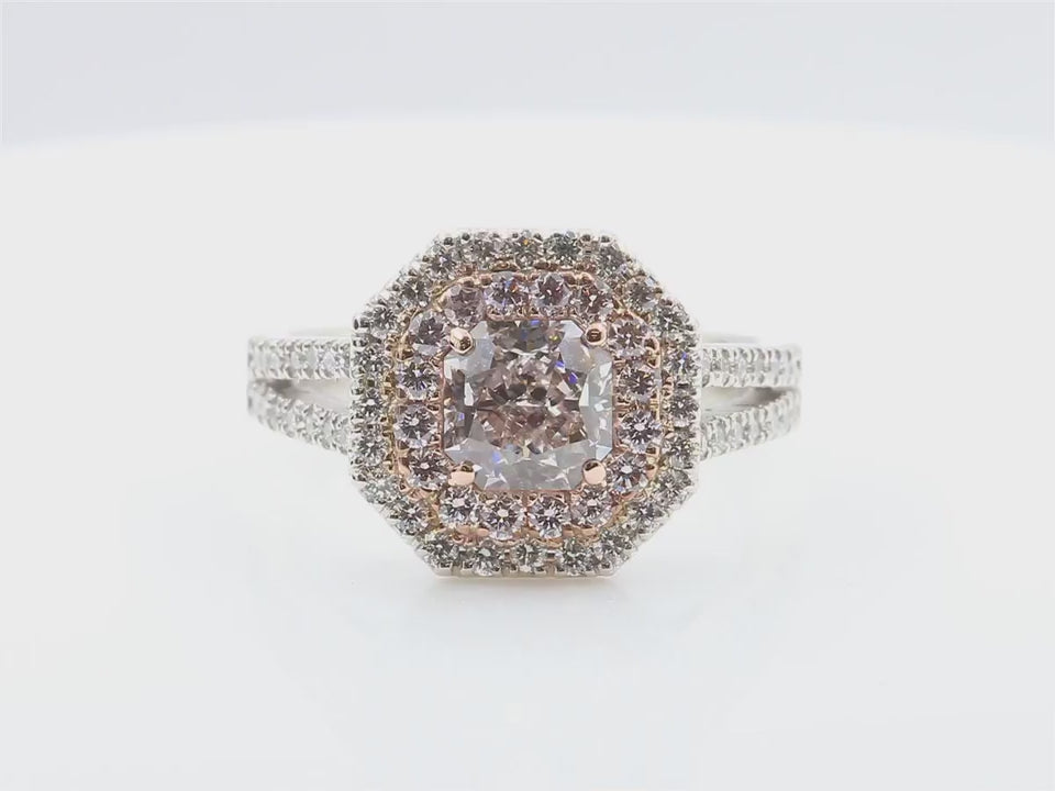 This captivating diamond ring showcases a 1.129ct cushion-cut Very Light Pink diamond certified by CGL (SI1), gracefully embraced by a double halo of pink and white round-cut diamonds.