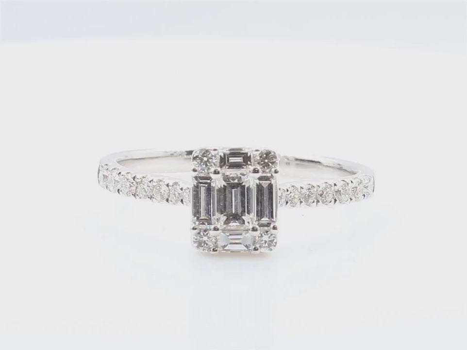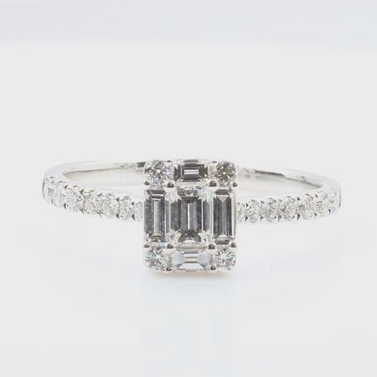 ラウンドカットとバゲットカットのダイヤモンドを組み合わせ、幾何学的に美しく配置したデザインが特徴のダイヤモンドリング。