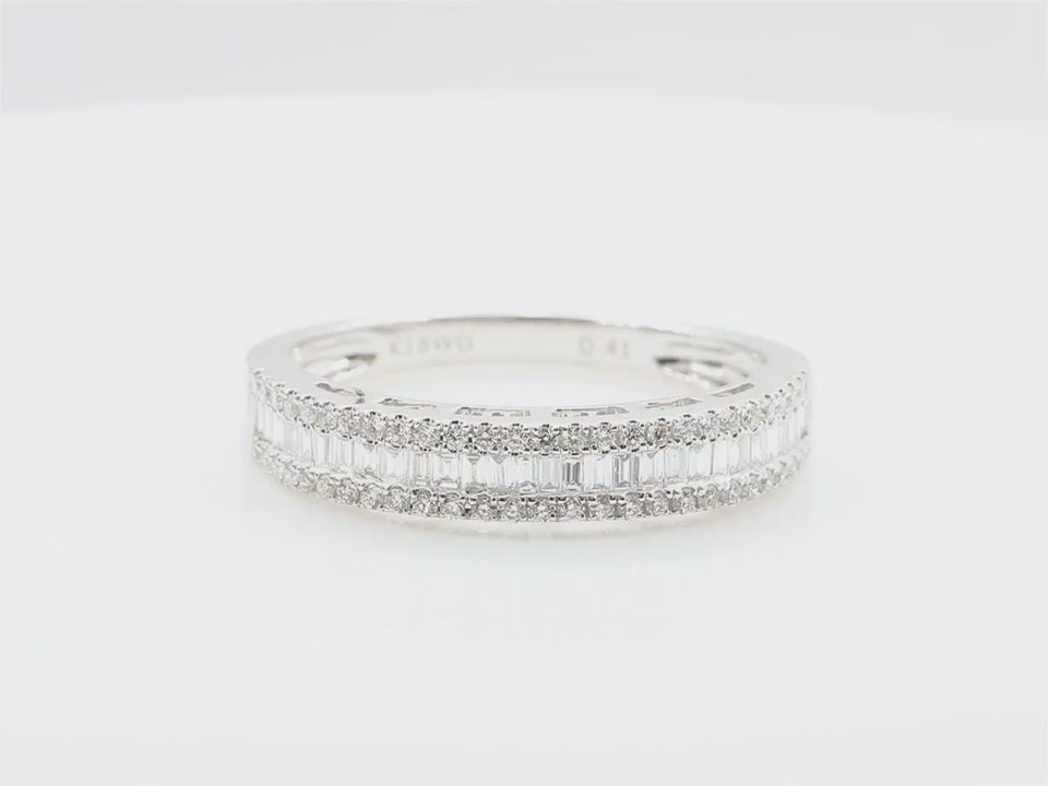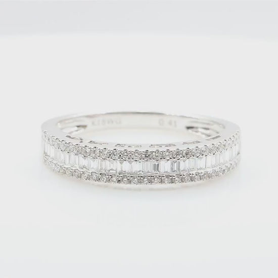 18Kホワイトゴールドの地金に、美しく整列したバゲットカットダイヤモンドを中心に、上下にラウンドブリリアントカットが繊細に配されています。