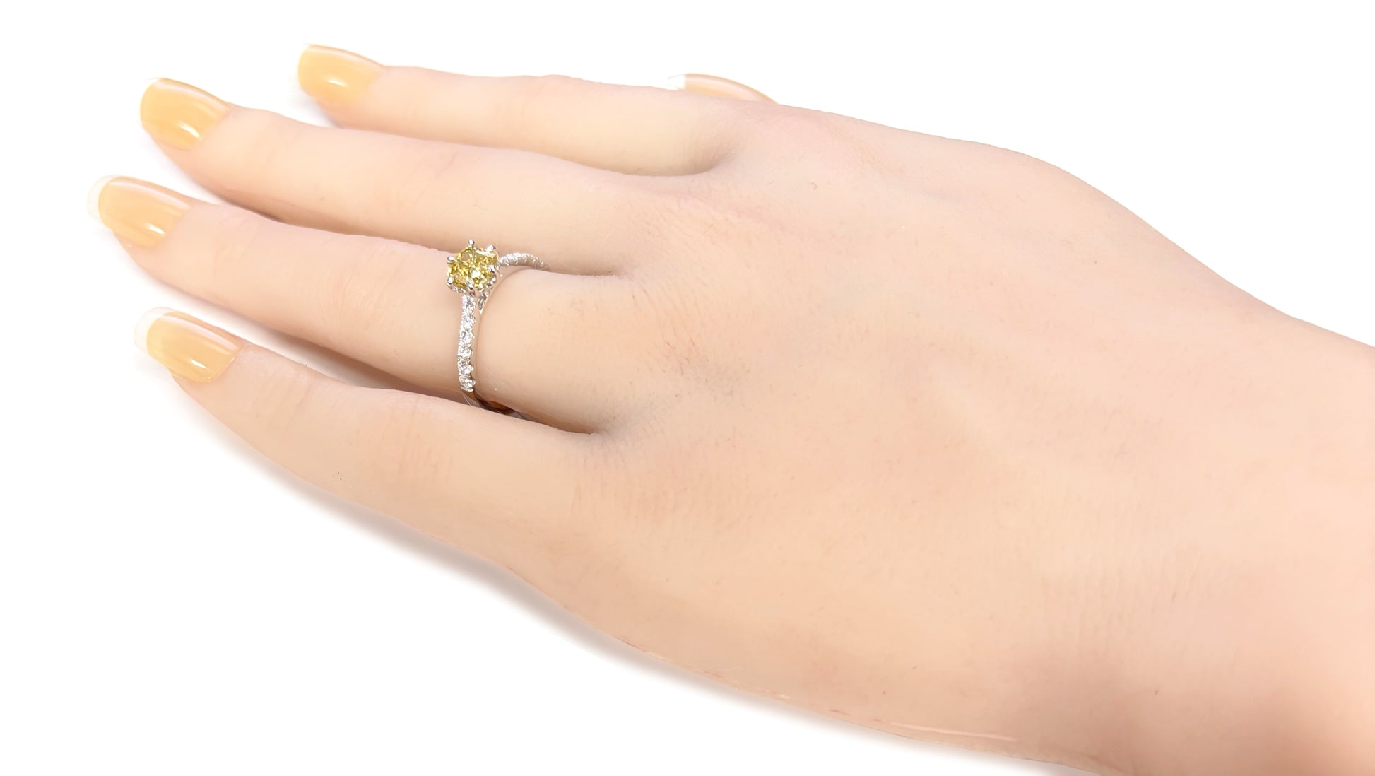 センターには深みのあるファンシーディープイエローのクッションカットダイヤモンド(0.914ct)を使用し、アームには上品なメレダイヤをあしらった華やかなデザイン。