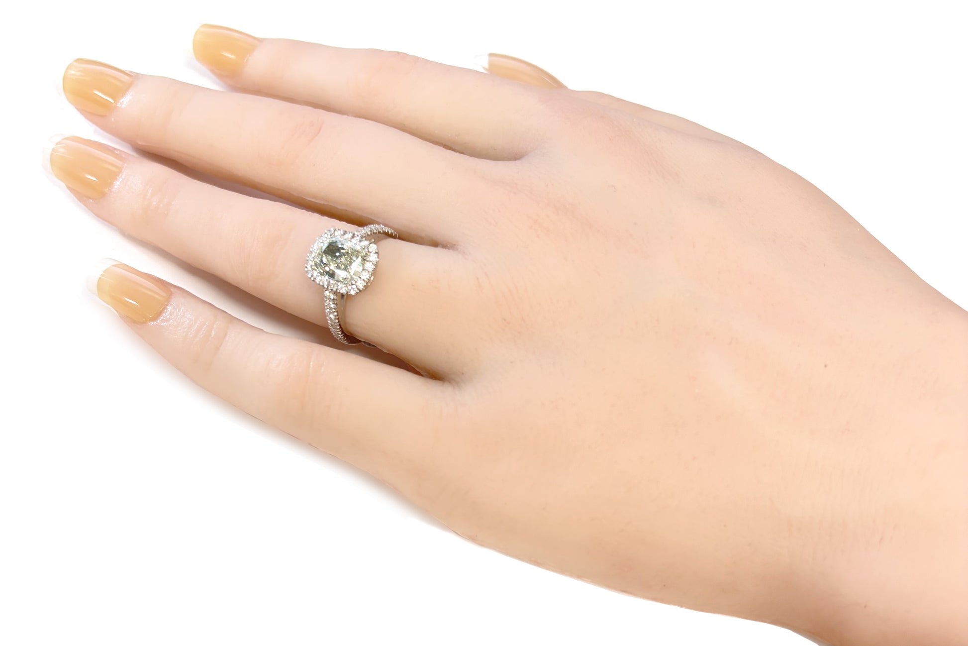 PT900 クッションカットダイヤモンド ハローリング - 2.373ct, ライトグリーンイエロー, SI2クラリティ