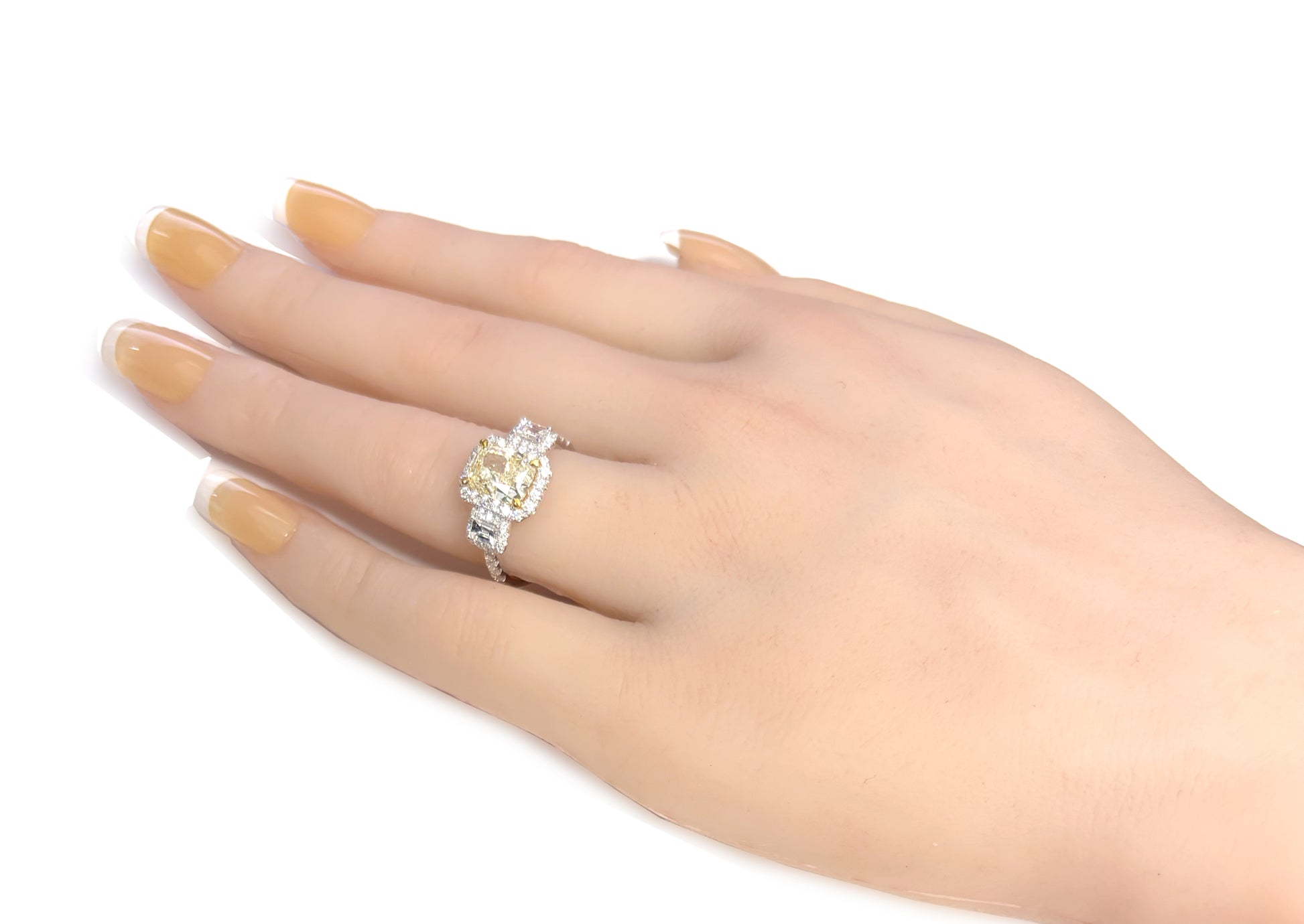華やかな存在感を放つ、2.01カラットのクッションカットイエローダイヤモンドを主役にした3ストーンリング。サイドにはエメラルドカットの白色ダイヤモンドが輝き、クラシカルで洗練された印象を演出します。