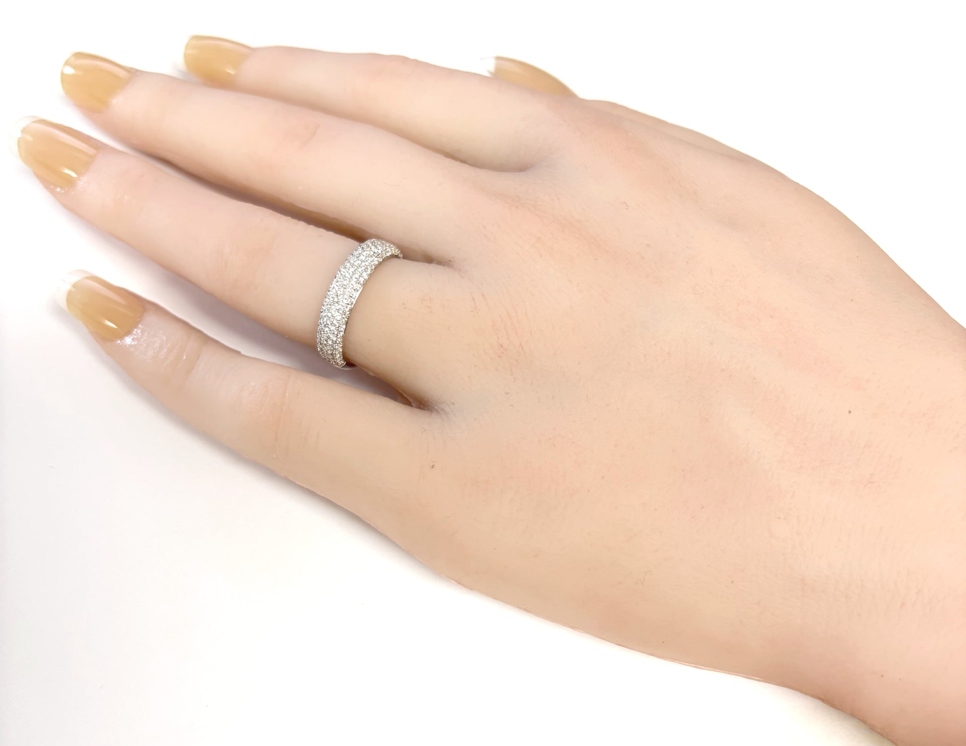この上品なダイヤモンドリングは、合計0.54カラットのラウンドブリリアントカットダイヤモンドをパヴェセッティングで美しくあしらい、流れるようなシルエットを描きます。