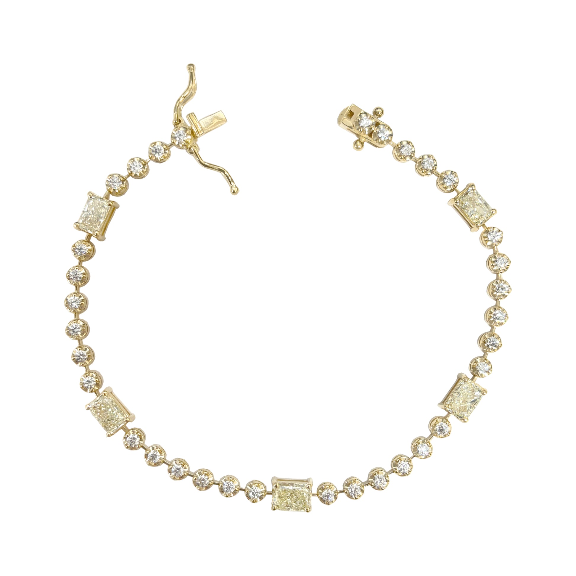 2.880カラットの鮮やかなイエローカラーのエメラルドカットダイヤと、0.980カラットの無色ラウンドブリリアントカットダイヤを交互にセッティングし、合計3.86カラットの輝きを実現。