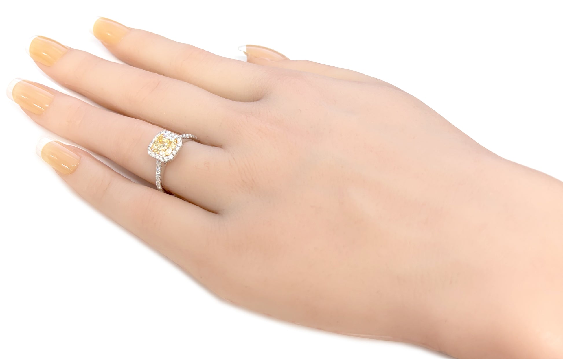 魅力的なクッションシェイプのファンシーライトイエローダイヤモンド、センターストーン1.352カラット(合計1.752ct)。