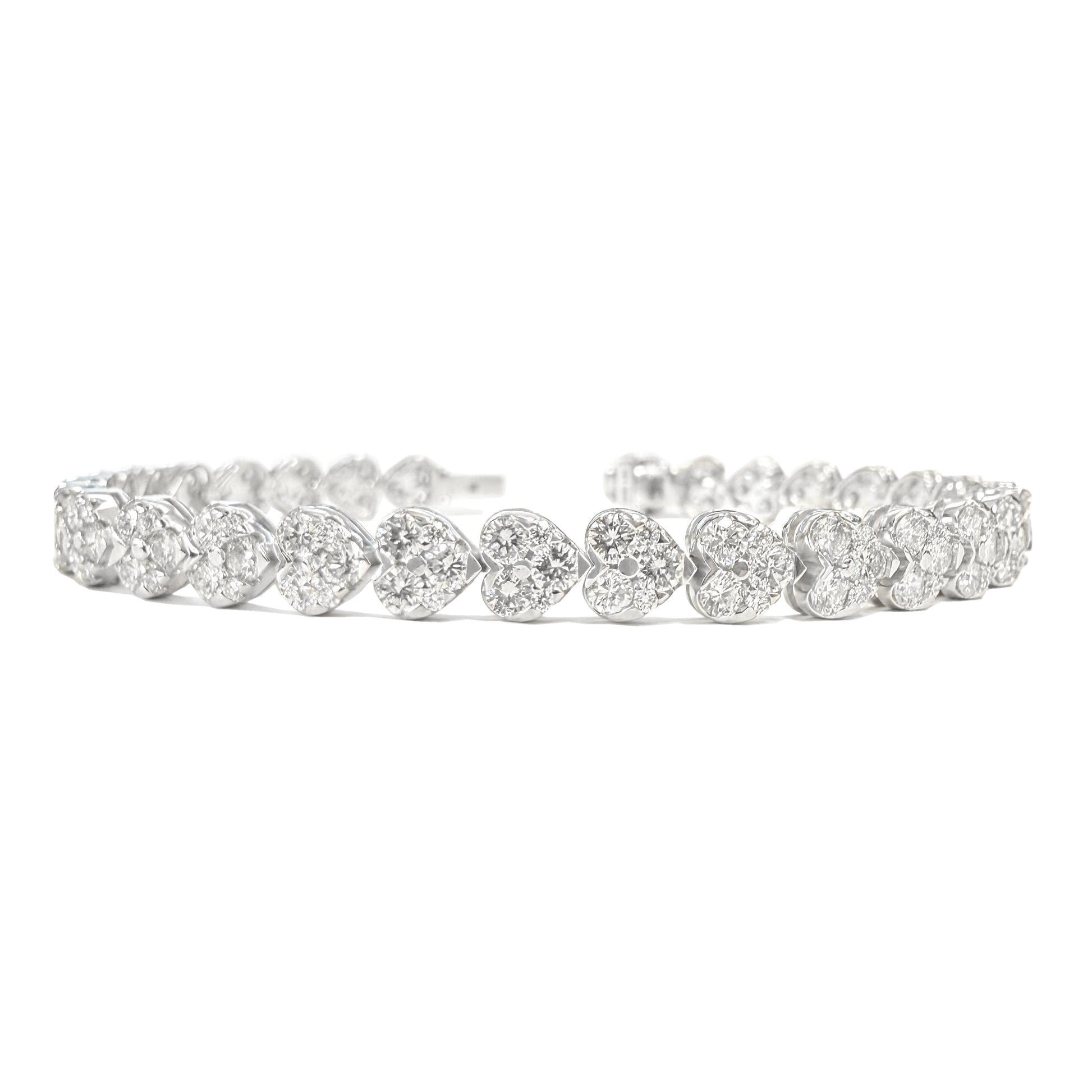 まばゆい輝きを放つダイヤモンドブレスレット。各ハートモチーフは、3石の大粒ラウンドカットダイヤモンドと2石の小粒ダイヤモンドで構成され、繊細かつ立体感のあるデザインに仕上げられています。