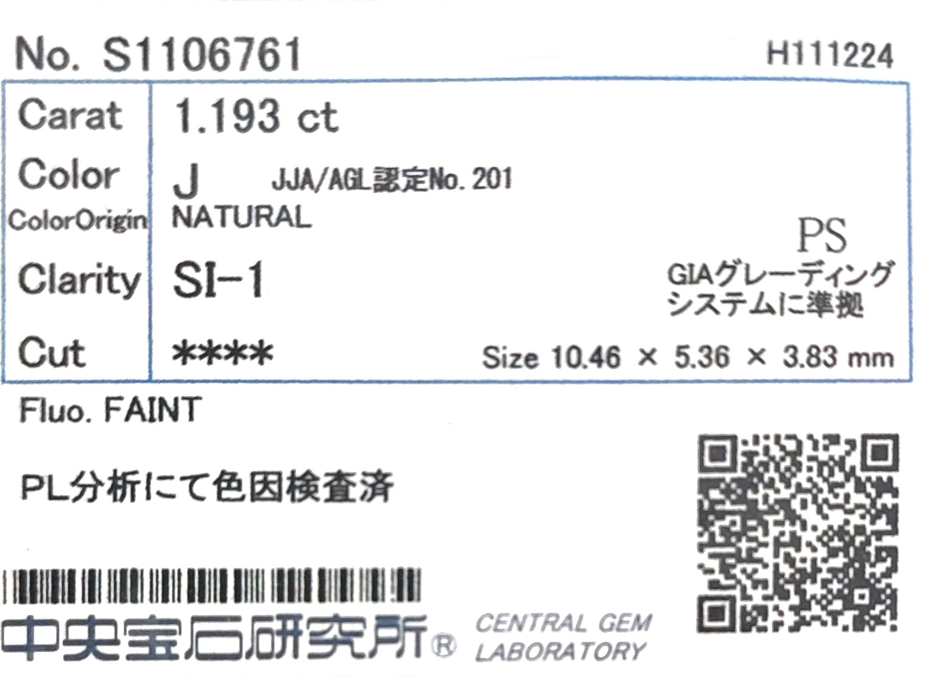 総カラット数は 1.853ct、クラリティは SI1。CGL(中央宝石研究所)による鑑定書が付属します。