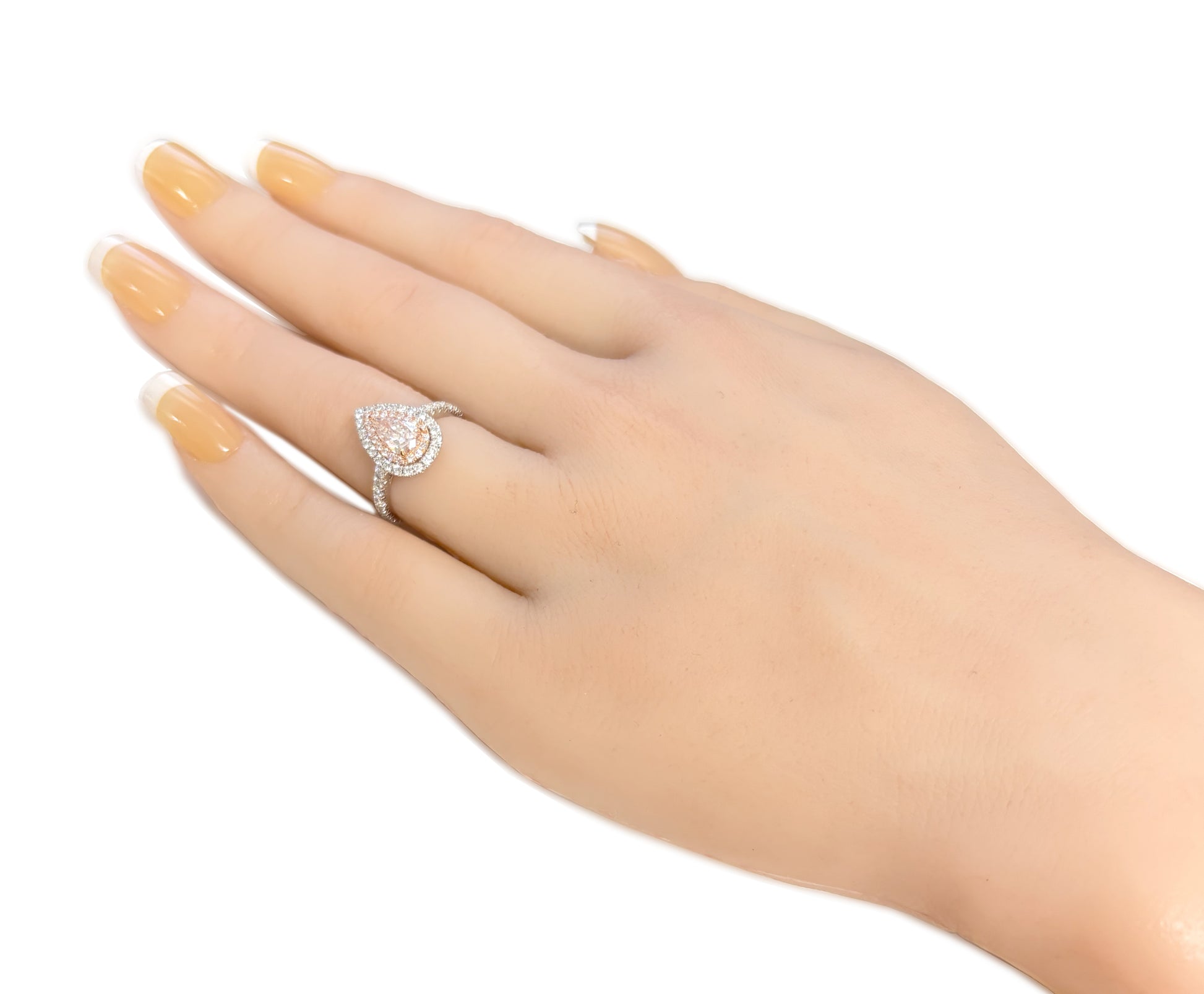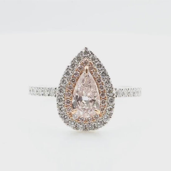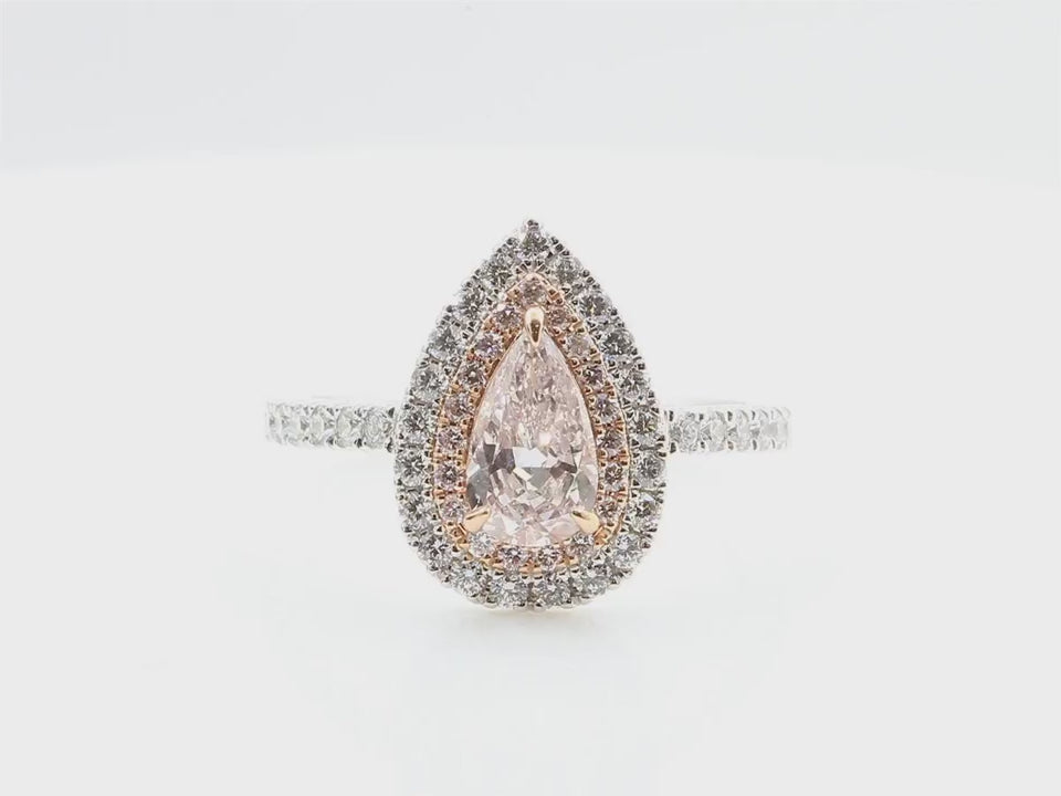 ライトオレンジピンクの0.575カラット・ペアシェイプダイヤモンドを主役にした、優美なエンゲージメントリング。