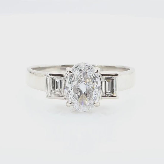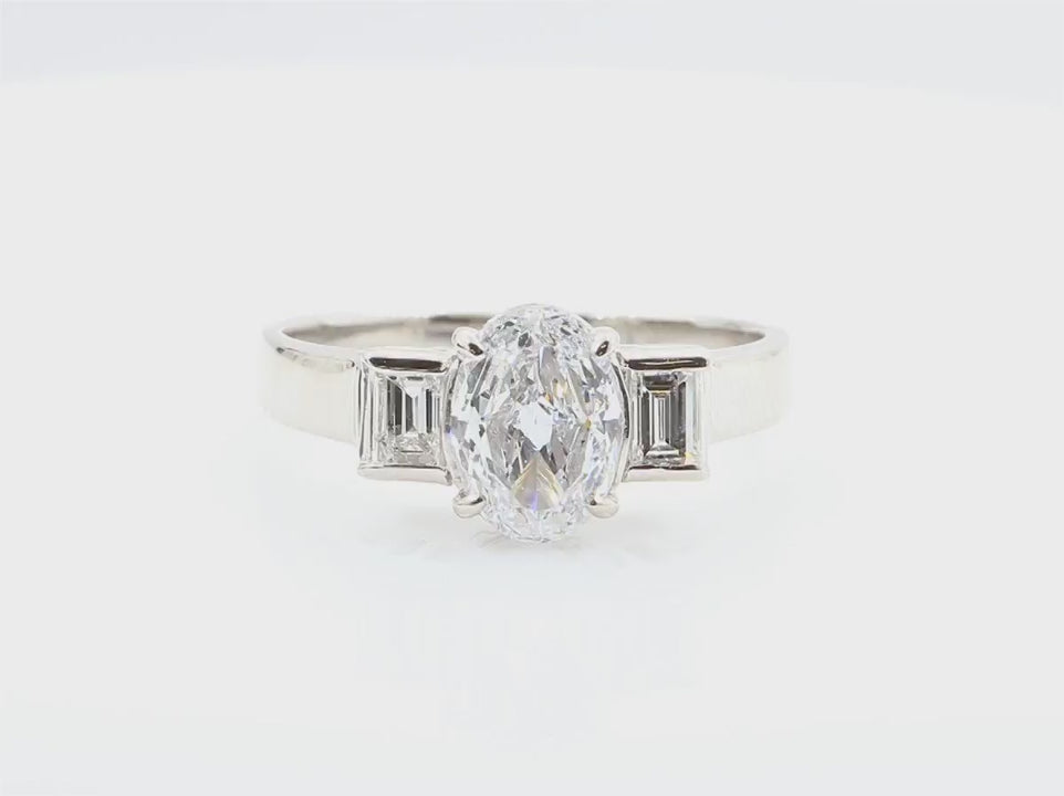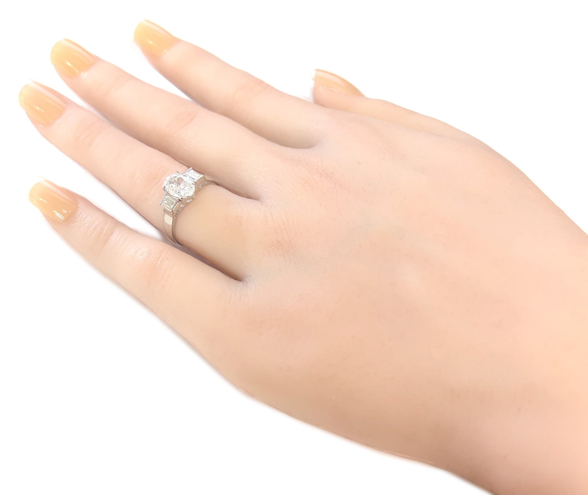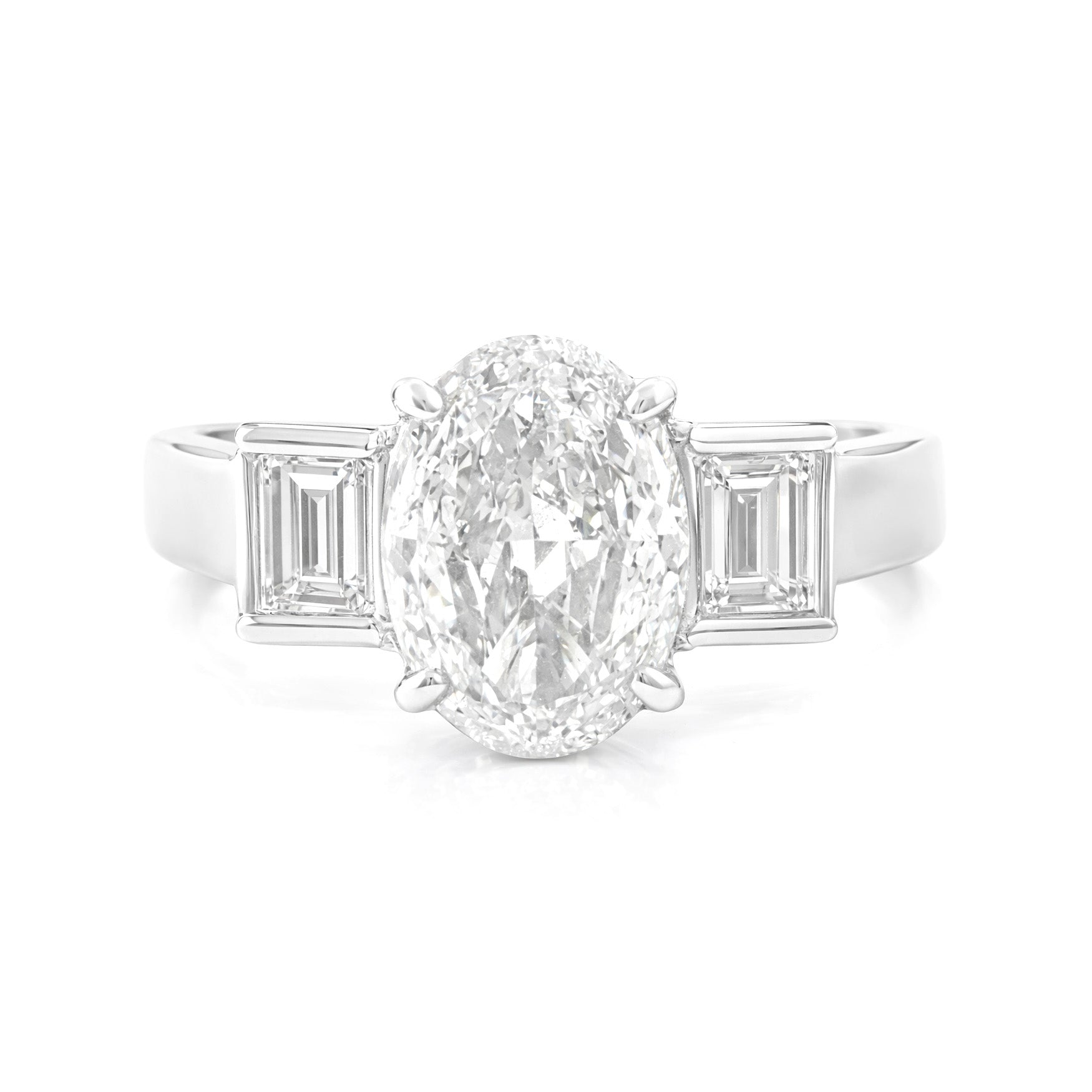 両サイドには上品なアクセントとなるテーパーバゲットダイヤを配し、クラシックなスリーストーンデザインに仕上げています。