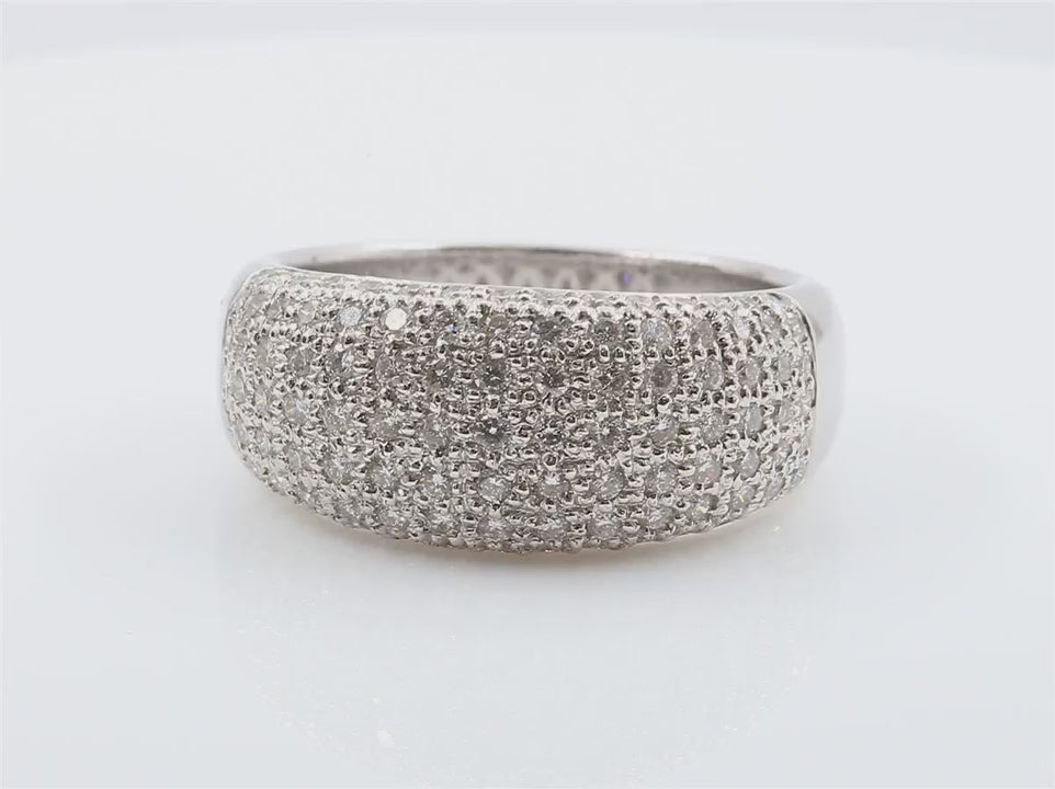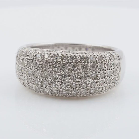 贅沢な18金ホワイトゴールドのアームに、ラウンドブリリアントカットダイヤモンドを5列にわたって敷き詰めたパヴェセッティングリング。