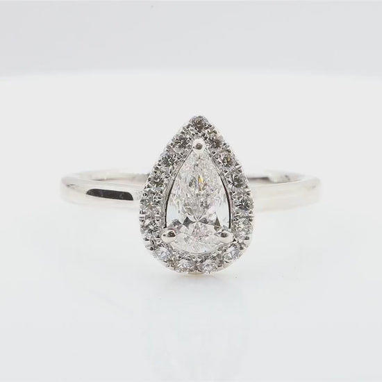 エレガントな輝きを放つペアシェイプのダイヤモンドハローリング。