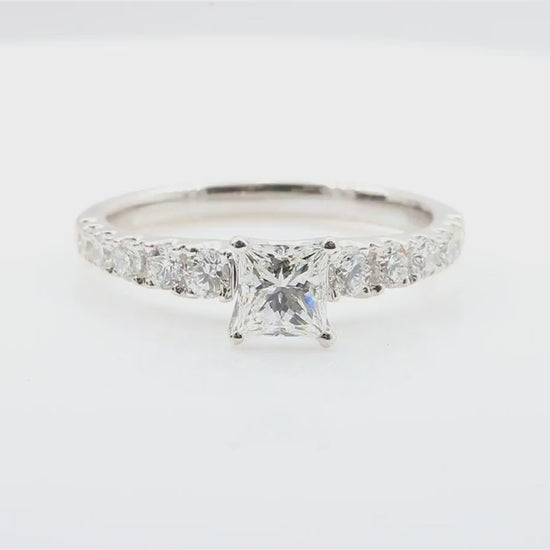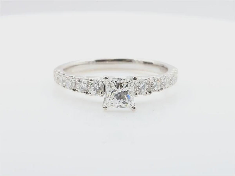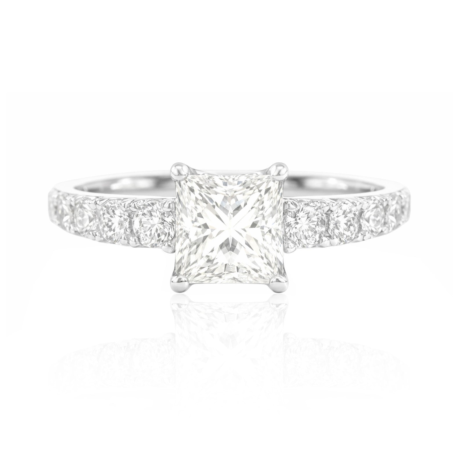 端正なプリンセスカットダイヤモンドが、18金ホワイトゴールドに美しくセッティングされたエレガントなリング。