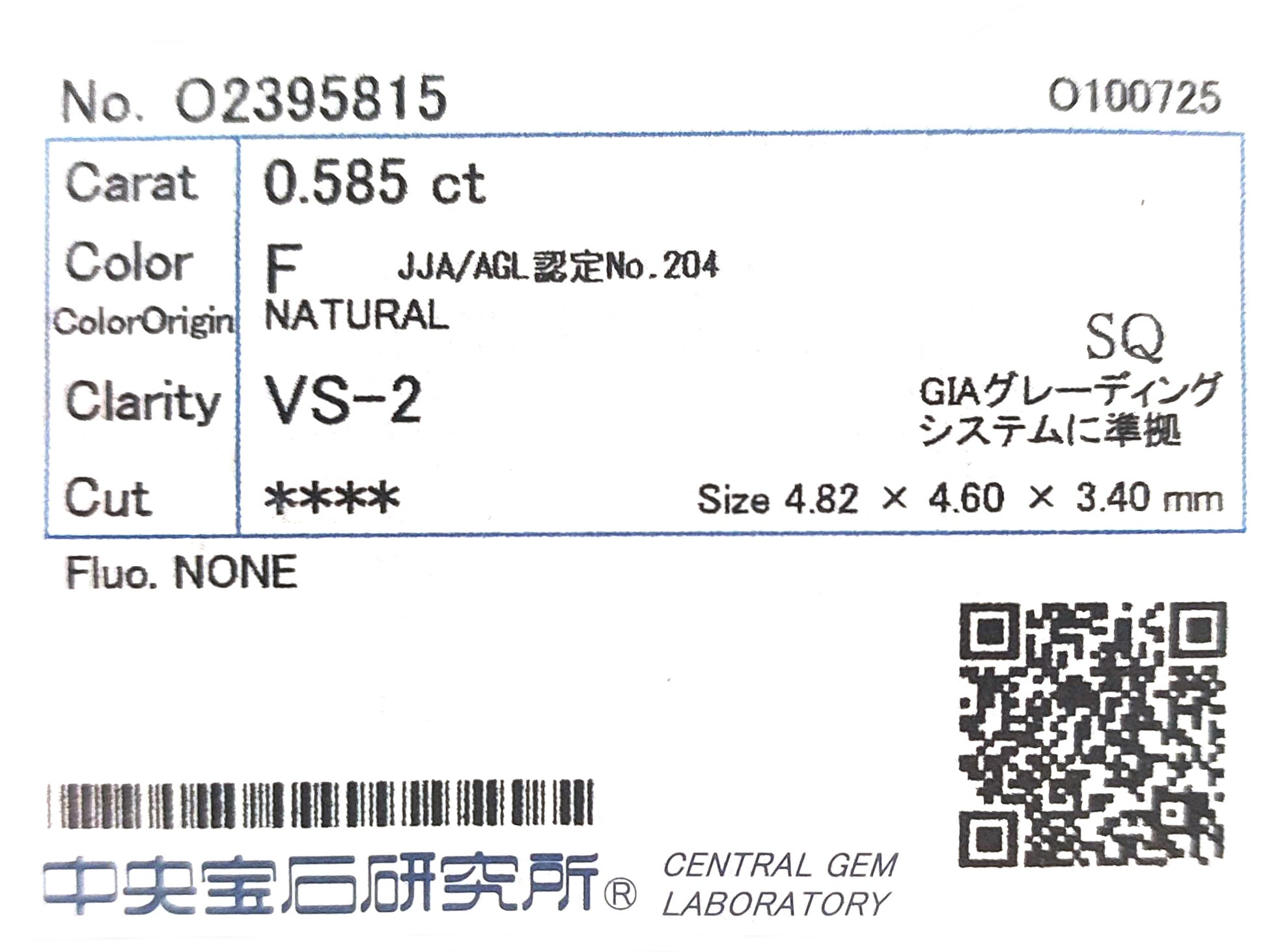 「無色」グレードの中で最後に位置する評価のFカラー。熟練の鑑定士でもごく僅かな色を認識できるほどで肉眼では確認することが非常に困難なグレード。