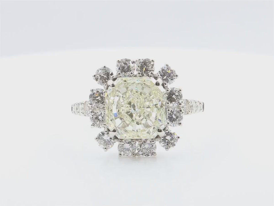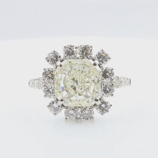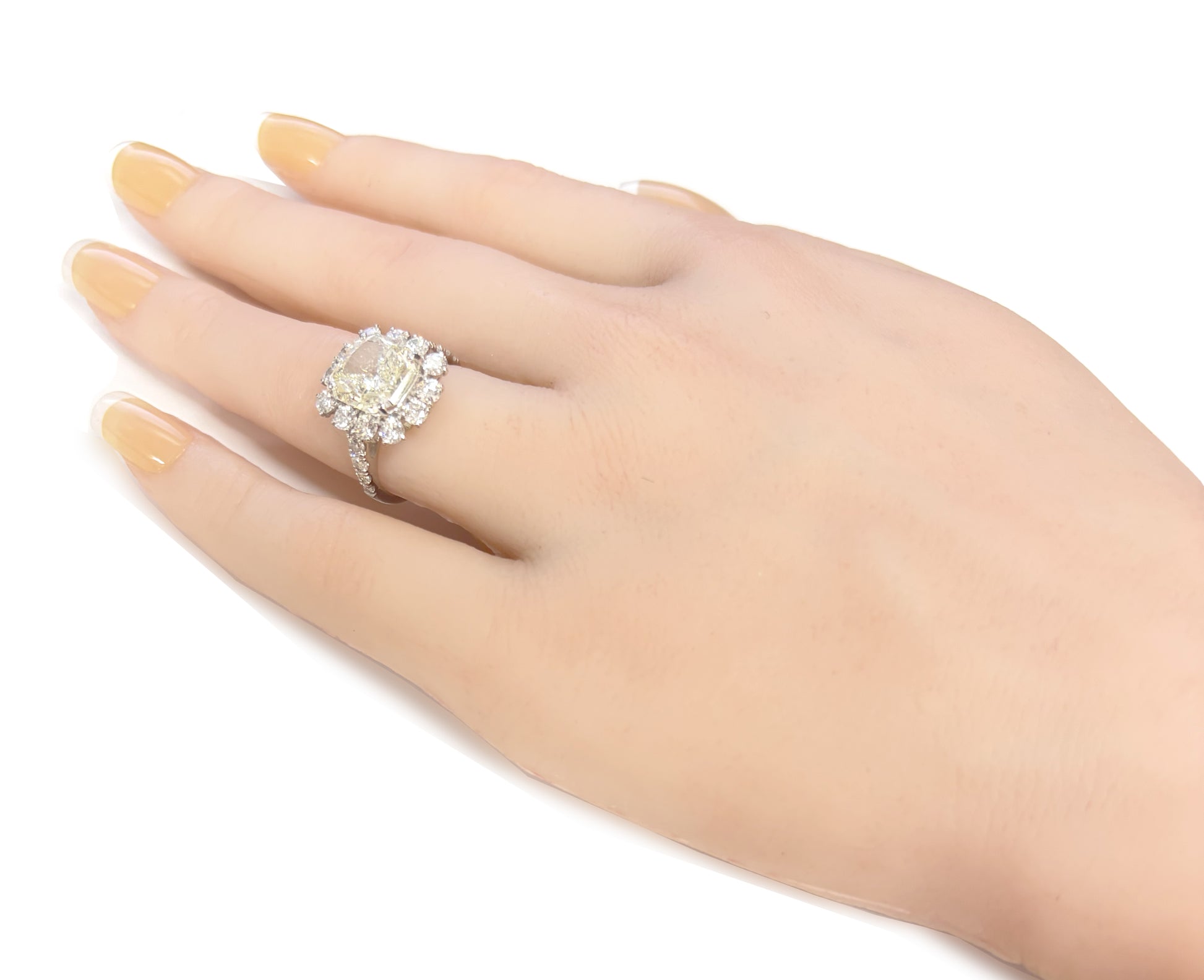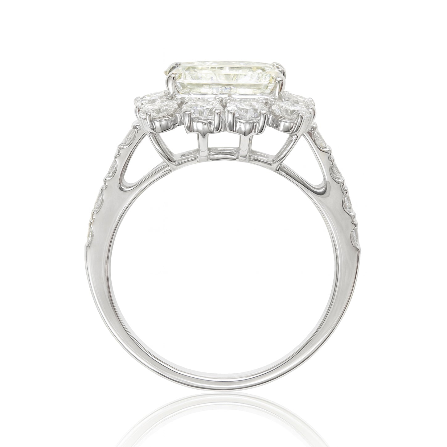 この魅力的なリングは、CGL認定の3.195カラットのラディアントカットダイヤモンドをセンターストーンにあしらい、温かみのあるMカラーとSI2クラリティが独自の個性と輝きを放ちます。