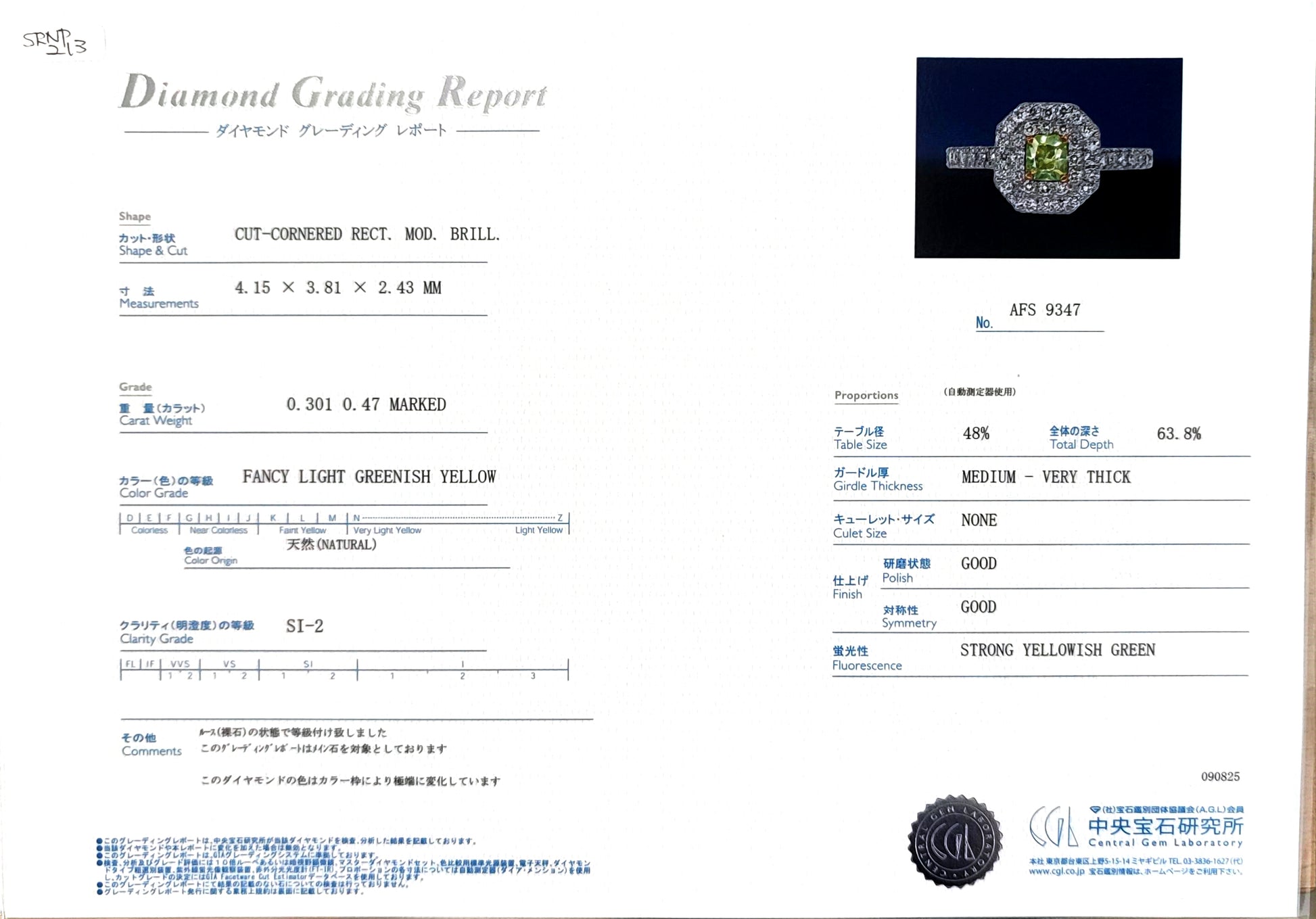 センターストーンには0.301カラット、SI2クラリティの希少なファンシーライトグリーンイエローダイヤを使用。