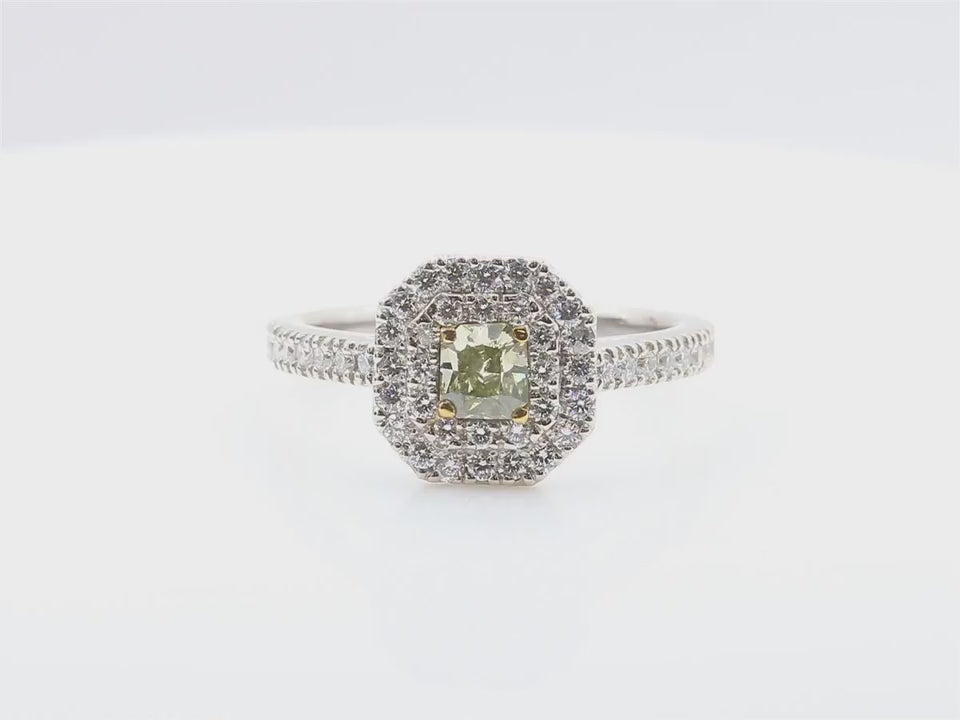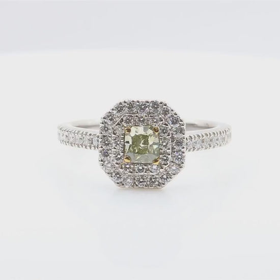 爽やかで個性的な輝きを放つ、ファンシーライトグリーンイエローのラディアントカット天然ダイヤモンドリング。
