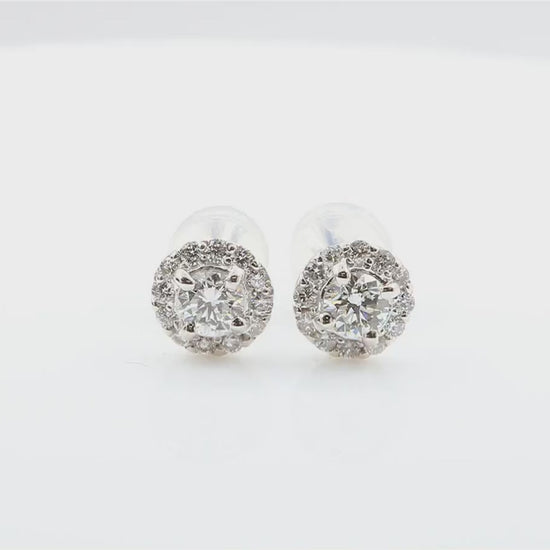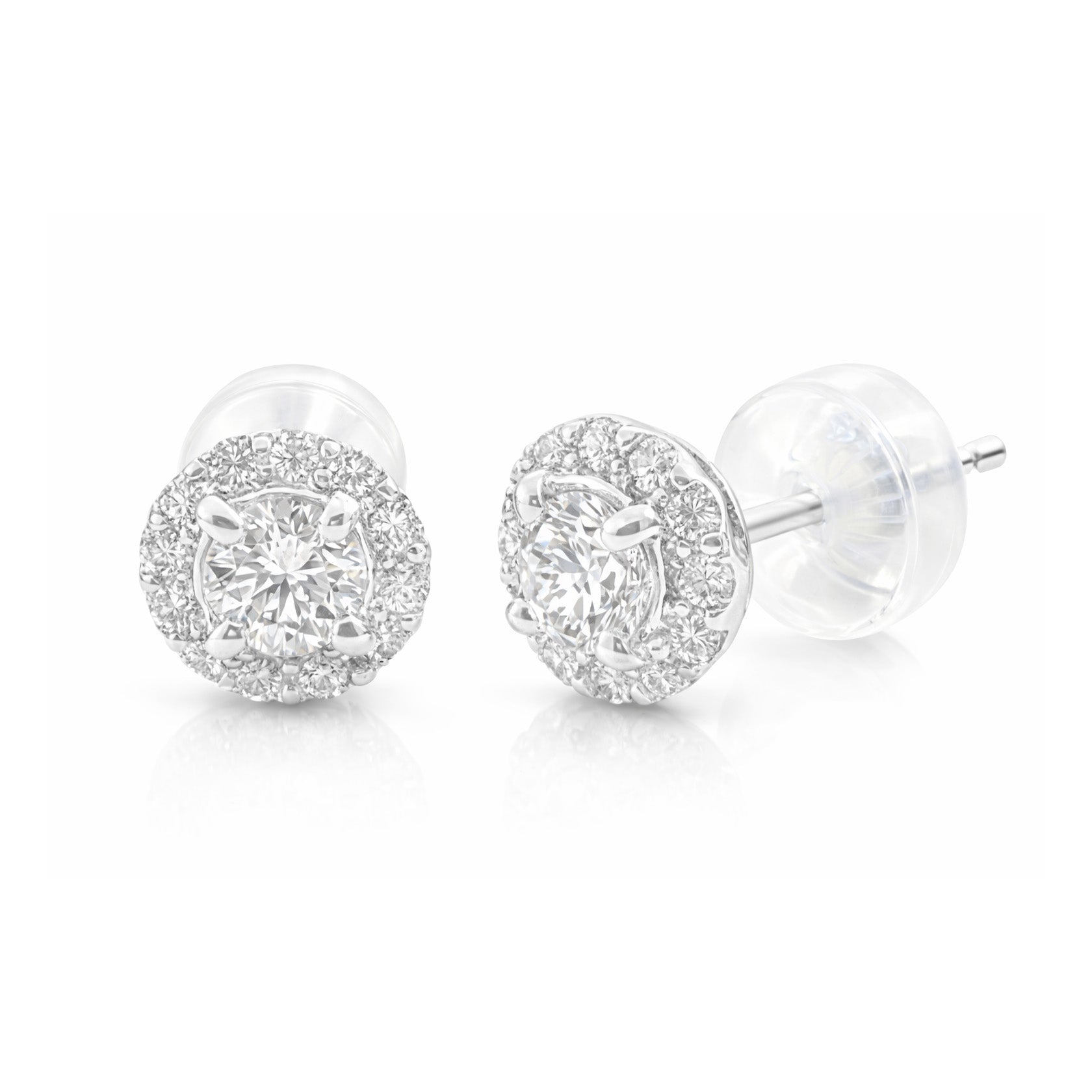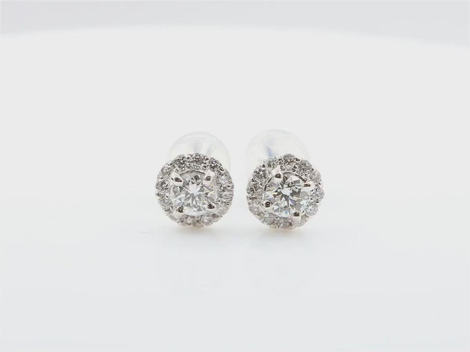 総0.54カラットのラウンドブリリアントカットダイヤモンドを贅沢に使用した、18Kホワイトゴールド製ハローイヤリングです。