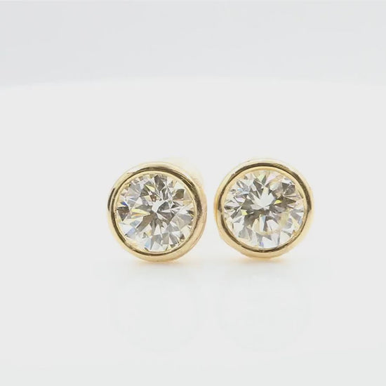 合計2.048ctの大粒ラウンドカットダイヤモンドを、18Kイエローゴールドで包み込むようにベゼルセッティングした存在感あふれるピアスです。