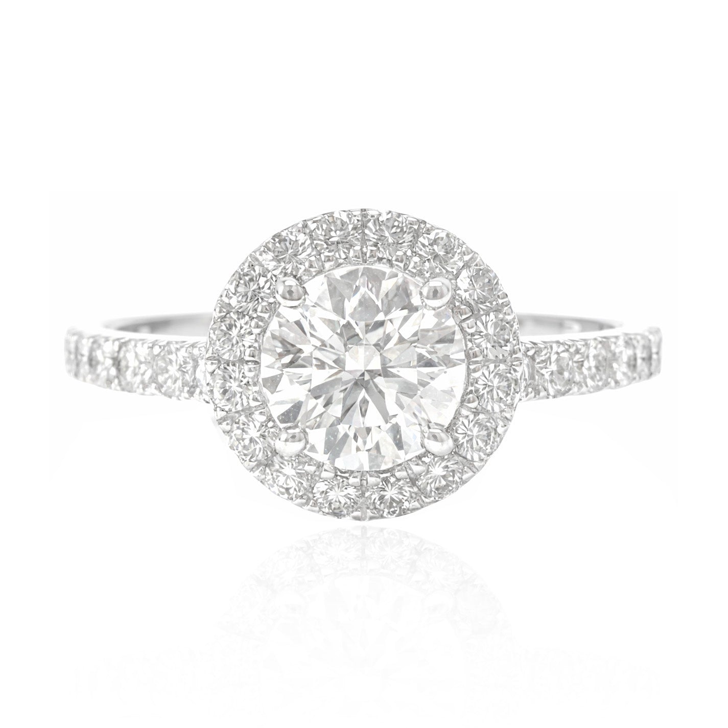 ラウンドブリリアントカットのダイヤモンドを贅沢に使用した、合計1.303カラットのリング。