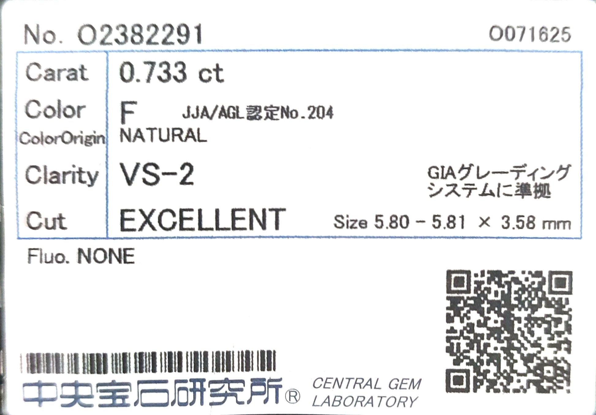 「無色」グレードの中で最後に位置する評価のFカラー。熟練の鑑定士でもごく僅かな色を認識できるほどで肉眼では確認することが非常に困難なグレード。